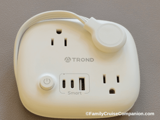 This Trond Power Strip debuted in late 2023, and it has been our personal favorite ever since. It has several unique features that make it a great option for cruise travel! Check out our detailed review of this compact Power Strip.