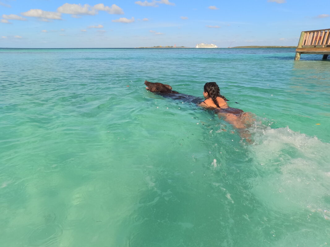 Swimming with the famous Exuma pigs in crystal-clear Bahamian water. (Courtesy of E. Warren)